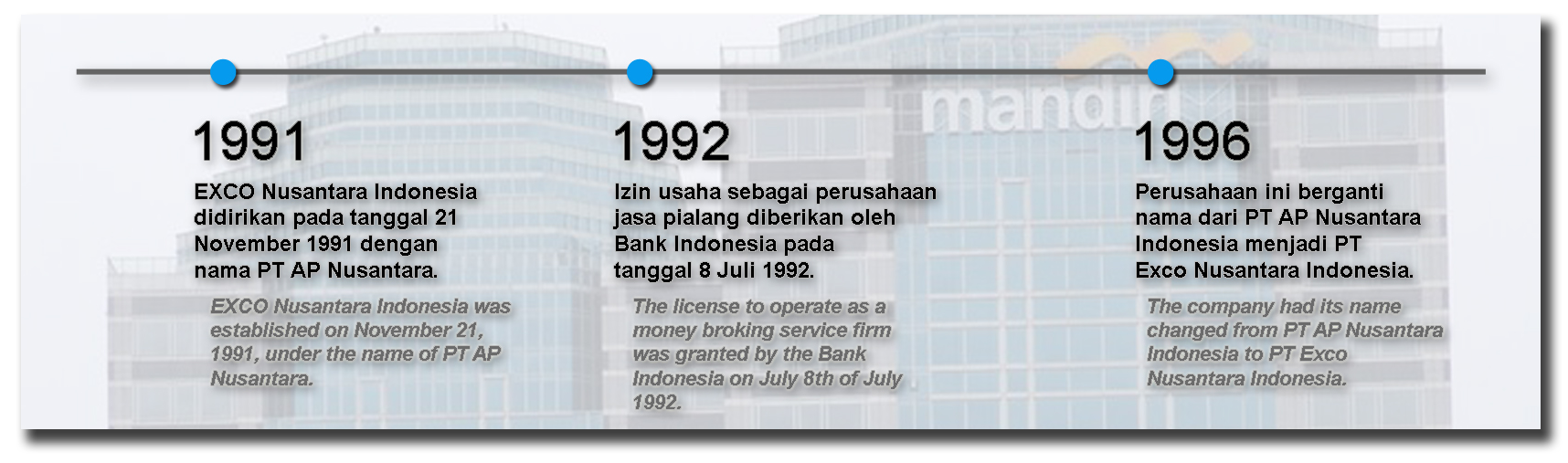 EXCO NUSANTARA INDONESIA was established on November 21, 1991 under the name of PT AP Nusantara Indonesia by the virtue of notarial deed Number 115 issued by Moendjiati Soegito, SH, Public Notary in jakarta. The approval from Minister of Justice was received on June 29th, 1992 under the letter of approval No. C2-52277 HT.01.01 Th92. The license to operate as a money broking service firm was granted by the Bank Indonesia on July 8th of July 1992 under the decree of the Bank Indonesia’s Board of Director No. 25/39/KEP/DIR. The company commenced operating on the very same day, the 8th of July 1992.